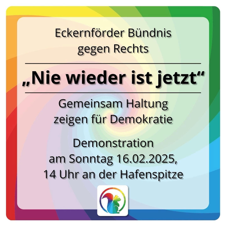 Mit über 3.000 Teilnehmenden war die Demo unter dem Motto „Nie wieder ist jetzt!“ in Eckernförde am vergangenen Sonntag, den 16.02.25 ein voller Erfolg bei bestem Wetter! Steht auf und seid laut für unsere Demokratie!